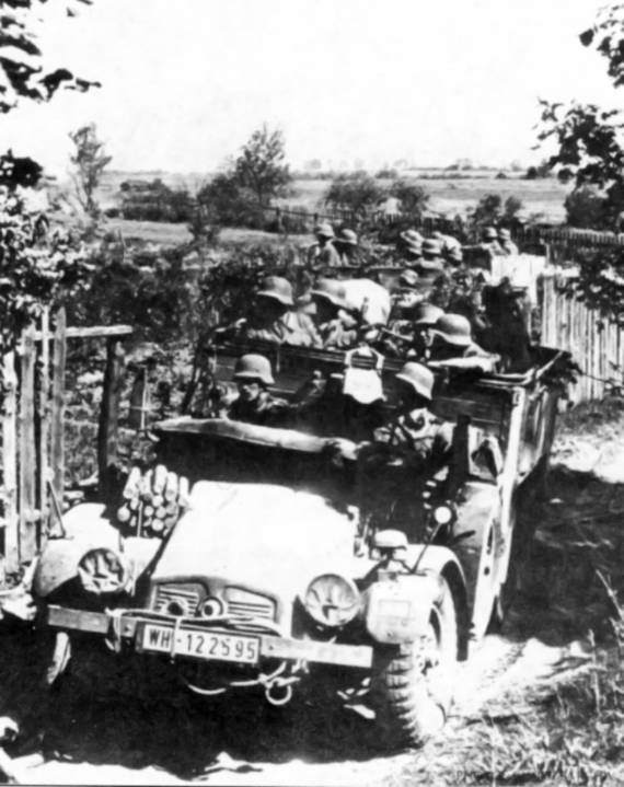 «Вы все еще считаете танки?» Колонна автомашин Крупп L2H43 где‑то на дорогах России. Лучшая комплектность автотранспортом танковых соединений вермахта существенно повышала их боевые возможности. Увлеченный подсчет только бронетехники сторон, которым грешат многие историки, описывающие контрудары мехкорпусов лета 1941 г., на самом деле дает крайне ограниченное представление о реальной силе противников. В течение всей войны немецкие танковые соединения уступали советским танковым дивизиям, а позднее танковым и механизированным корпусам (организационным аналогам дивизий) по числу танков, но превосходили их в артиллерийском отношении. Соответственно, часть задач, которые решались немцами при помощи артиллерии, советским танковым соединениям приходилось решать танками. Сразу после войны, 21 мая 1945 г., в докладе командующему бронетанковыми и механизированными войсками 1‑го Белорусского фронта руководство 2‑й гв. танковой армии предлагало: «Основные штатные изменения, вносимые на совещаниях и заседаниях, касались следующих моментов: […] 3. Усиления артиллерии армейского и корпусного подчинения, с целью большей самостоятельности армии, особенно в период ее боевых действий в оперативной глубине. Это усиление идет по линии необходимости иметь: – артиллерию с навесной траекторией, для чего в состав артбригады предлагается ввести четвертый гаубичный полк и по одному гаубичному полку в корпусе; – контрбатарейную группу 152 мм П[ушек‑]Г[аубиц] [54]. Даже в 1945 г., на вершине своего могущества в войне, советские танковые войска не имели сильной гаубичной артиллерии. Установки залпового огня («катюши») лишь частично перекрывали задачи тяжелой артиллерии. Причина этой слабости была в отсутствии в СССР подходящего тяжелого скоростного тягача в достаточных количествах. Напротив, немецкие танковая и моторизованная дивизии с первого до последнего дня войны обладали гаубичной артиллерией калибра 150‑мм, буксируемой полугусеничными тягачами. Советские танковые соединения в 1943–1945 гг. пользовались эффективной артиллерийской поддержкой только при действиях совместно со стрелковыми корпусами и общевойсковыми армиями, как правило, в период преодоления тактической обороны противника. Немецкие танковые соединения в 1943 г. получили бронированную самоходную артиллерию (105‑мм САУ «Веспе» и 150‑мм САУ «Хуммель»), весьма устойчивую к контрбатарейной борьбе. С появлением у немцев САУ появилась разница не только в весе залпа артиллерии подвижных соединений СССР и Германии, но и в возможностях ведения ими артиллерийских дуэлей. Подсчеты только танков в связи с этим выглядят еще глупее. В 1941 г. к слабости артиллерии (чаще всего просто отстававшей в процессе маневрирования соединения) прибавлялся недостаток пехоты. Во‑первых, это были недостатки штатной организации танковых дивизий образца 1941 г. В СССР была повторена типичная ошибка раннего этапа строительства механизированных соединений – они были перегружены танками и недогружены пехотой. Через этот этап проходили в разное время танковые войска Германии, Англии и США. Во‑вторых, заложенная в штат недогрузка усугублялась неотмобилизованностью армии. До поступления автомашин по мобилизации многие танковые соединения были фактически лишены большей части штатной мотопехоты и моторизованн