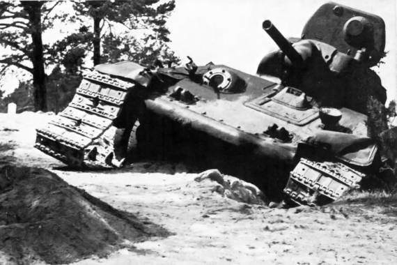 Подбитый танк Т‑34 ранних серий с 76‑мм орудием Л‑11. В Киевском особом военном округе такие машины были в 8‑й танковой дивизии П.С. Фотченкова из состава 4‑го механизированного корпуса. Новые танки были вынуждены сдерживать крупные массы пехоты 17‑й армии Штюльпнагеля. У 6‑й армии в июне 1941 г. был фронт, даже больший, чем у 6‑й и 7‑й гвардейских армий (64 км и 50 км соответственно), вместе взятых, на южном фасе Курской дуги в июле 1943 г. При этом и в 6‑й гвардейской, и в 7‑й гвардейской армиях было по семь стрелковых дивизий. Представим, что в июле 1943 г. в 6‑й гв. армии И.М. Чистякова не семь, а полторы, пусть даже две дивизии. В этом случае 4‑я танковая армия Г. Гота в ходе «Цитадели» дошла бы до Курска дня за два, максимум за три. И так Воронежскому фронту пришлось задействовать в отражении удара немцев две танковые армии. На удержание 140 км фронта при остром недостатке пехоты тем более требовалось, по крайней мере, два мехкорпуса. Поэтому Музыченко инстинктивно подтянул ближе к фронту своей армии не только 4‑й механизированный корпус А.А. Власова, но подчиненный 6‑й армии вечером 22 июня 8‑й механизированный корпус Д.И. Рябышева. Это в сравнении с кошмаром, творящимся в полосе соседней 5‑й армии, положение войск 6‑й армии на северном фасе львовского выступа было терпимым. В абсолютных оценках оно было катастрофическим, как, впрочем, и у большинства приграничных армий всех трех фронтов. Скрепя сердце командование Юго‑Западного фронта отобрало у Музыченко корпус Рябышева, успевший помотаться по дорогам львовского выступа, и выдвинуло его для контрудара в интересах удержания фронта 5‑й армии. Титаническими усилиями Жуков вытащил из 6‑й армии 8‑ю танковую дивизию для действий совместно с 15‑м мехкорпусом.