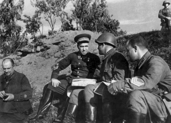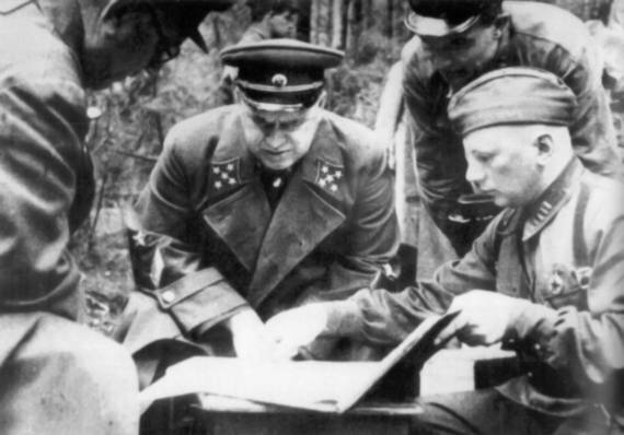 На передовой. Г.К. Жуков слушает доклады командира и летчика, лето 1941 г. План Жукова, который стоил ему должности начальника Генерального штаба Красной армии, заключался в усилении Центрального фронта за счет двух направлений. Фронт оказался под ударом крупной массы немецкой пехоты и требовал немедленной накачки резервами. В случае реализации жуковского плана, во‑первых, высвобождались силы за счет ликвидации ельнинского плацдарма и сопутствующего ликвидации сокращения протяженности линии фронта. Во‑вторых, необходимые для усиления Центрального фронта соединения высвобождались за счет эвакуации плацдарма на правом берегу Днепра, т. е. сдачи Киева. Политическое руководство СССР в лице И.В. Сталина признало такой вариант решения проблем Центрального фронта недопустимым, и Г.К. Жуков был сменен на Б.М. Шапошникова. Кризис в отношениях между военным и политическим руководством летом 1941 г. имел место не только в Германии, но и в СССР. Г.К. Жуков стал жертвой этого кризиса. Он был понижен в должности до командующего фронтом. Ельнинский выступ был не просто выдающейся на восток частью советско‑германского фронта. Во‑первых, в районе Ельни немцами был образован плацдарм на левом берегу Десны. Рубеж любой крупной реки является удобной позицией для построения устойчивого фронта. Плацдарм на занимаемом обороняющемся берегу реки изначально является брешью в линии обороны. Поэтому постоянно повторяющимся сценарием ведения боевых действий во время Второй мировой войны была борьба за плацдармы. Наступающий стремился решительным рывком вперед захватить плацдарм и тем самым не дать обороняющемуся полностью удержать за собой рубеж водной преграды. Понятно, что после сбора на этом рубеже резервов обороняющегося захватывать плацдарм будет вдесятеро труднее. Даже находившийся не в лучшем состоянии вермахт отметился упорной борьбой за Кюстринский плацдарм в феврале – марте 1945 г. Немцы тогда из последних сил провели целый ряд наступлений против захваченных войсками 5‑й ударной и 8‑й гвардейской армиями плацдармов на западном берегу Одера. Плацдарм, в отличие от полностью сохраненного рубежа реки, поглощает больше сил обороняющегося. Чем он больше и чем длиннее его периметр, тем больше сил на нем можно накопить и тем больше сил нужно для предотвращения его «вскрытия» и дальнейшего наступления с него. Поэтому ликвидация плацдармов наступательными действиями была общим правилом для обоих противником. Во‑вторых, Ельня была узлом коммуникаций, что делало ее привлекательной в качестве плацдарма для наступления. С точки зрения обороняющегося, удержание за собой Ельни означало удержание проходящей параллельно фронту рокады. Отрицание В. Суворовым положительного эффекта от действий Жукова под Ельней идет в двух плоскостях. Первая – это возражения тактического характера: «Но в Ельнинском выступе поначалу была не только пехота, там находилась танковая группа Гудериана, а это – четверть германской танковой мощи. Нет ничего более страшного и глупого, чем бросать пехоту на врытые в землю танки. Танк в обороне – несокрушимая мощь. Над землей возвышается только башня с пушкой и пулеметами. Башня замаскирована. Но даже если маскировка и сорвана, попасть в башню не так просто. И не всякое попадание означает пробоину. Экипаж врытого в зем