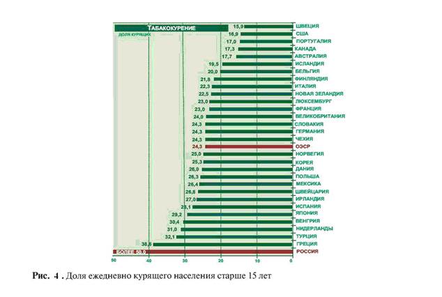 В 2002 г. потребление алкоголя в стране составило 14,5; 2,4 и 1,1 л в год в пересчете на чистый спирт соответственно у мужчин, женщин и подростков, или в среднем около 11 л в год на душу взрослого населения (по данным Роспотребнадзора, 18 л в год на душу взрослого населения). Потребление крепких алкогольных напитков в абсолютных цифрах в РФ с 1990 г. не уменьшилось, хотя в структуре потребления их доля уменьшилась до 15% из-за резкого увеличения потребления пива. Табакокурение. В Российской Федерации потребление сигарет с 1985 по 2006 гг. увеличилось на 87%, в основном, за счет увеличения курильщиков среди женщин и подростков. В настоящее время в стране курят более 40 млн человек: 63% мужчин и 30% женщин, 40% юношей и 7% девушек. Доля курящих мужчин в России одна из самых высоких в мире и в 2 раза больше, чем в США и странах ЕС. Ежегодно количество курящих в России увеличивается с темпом в 1,5—2%, захватывая женщин и подростков. Темп роста курящих в России является одним из самых высоких в мире и при этом в последние три года количество сигарет, выкуриваемых в стране, увеличивается на 2—5% в год. Курение вызывает рост болезней системы кровообращения, приводит к хроническим заболеваниям легких и провоцирует многие онкологические болезни.