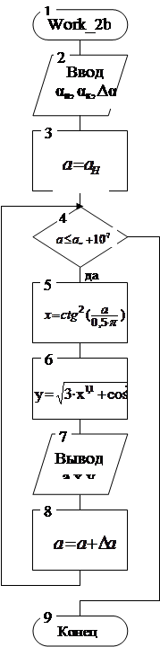Многократно повторяющиеся действия описывается циклическим алгоритмом. Так, как число повторений в данной задаче заранее известно, алгоритм решения задачи можно описать в виде арифметического цикла (схема Work_2a), а также в виде цикла “Пока” (Work_2b) и цикла “До” (Work_2c).
