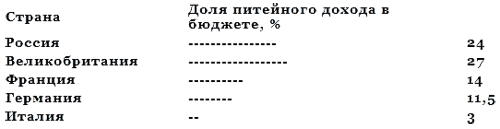 Питейный доход в России в конце XIX века в сопоставлении с питейным доходом в других крупных странах Европы (в процентах к общему бюджету каждой страны)