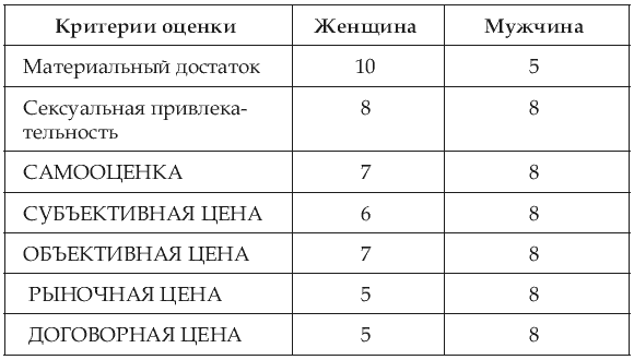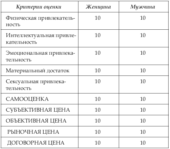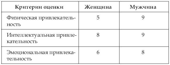 Перед нами первая пара, пример идеальной самооценки и идеального соотношения партнеров. Конечно, в жизни такие пары – большая редкость, поэтому привожу этот пример в качестве некоей позитивной крайности. Но даже если бы партнеры оценили себя и друг друга не на 10 баллов, а ниже, но оценки были бы все равно в среднем одинаковые, можно было бы говорить о равноценности партнеров.