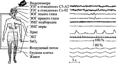 Полисомнография. В лаборатории сна врачи измеряют: электрическую активность мозга (ЭЭГ), движения глаз (ЭОГ) справа и слева, напряжение мышц подбородка и икры, храп, токи сердца (ЭКГ), содержание кислорода в крови (Sa02), воздушный поток через нос и рот, а также дыхательные движения грудной и брюшной стенки. Медицинское определение гласит: «Сон – это регулярно повторяющееся состояние обратимого в любой момент, более или менее выраженного отсутствия сознания». Но докторантка Мюнх в соседней комнате, отслеживающая на экране компьютера все важные для сомнологов показатели моей физиологии, ищет совсем другие, не менее, если не более, надежные признаки: так называемые тета‑волны, сонные веретена и К‑комплексы. Все это – характерные рисунки электрической активности головного мозга. Первым успешно опробовал этот метод на людях неутомимый немецкий психиатр Ханс Бергер примерно 80 лет назад. Так он между делом создал предпосылки, без которых современная сомнология вообще не могла бы существовать. Бергер, заведовавший в Йене неврологическим отделением, на протяжении года регулярно прикреплял подопытным на кожу головы тонкие серебряные пластинки и подключал к чувствительному вольтметру. Затем он замерял разницу напряжения между серебряной пластинкой и так называемым индифферентным электродом, подвешенным на голове где‑нибудь подальше от мозга, например за ухом. В 1925 г. ему наконец удалось доказать, что живой мозг и вправду самостоятельно порождает колебания напряжения. В 1929 г. он впервые сделал запись электрической активности мозга у спящего. Бергер также изобрел употребляемые до сих пор названия как для метода в целом, так и для различных вариантов токов мозга. Каракули своего прибора он назвал энцефалограммой. Сегодня их обычно именуют электроэнцефалограммой, сокращенно ЭЭГ. Энцефалограмма показывает суммарную электрическую активность, возникающую внутри нескольких миллионов нейронов коры мозга, расположенных поблизости от электрода. Иногда их активность протекает очень ритмично и согласованно, а иногда – вразнобой. В первом случае ЭЭГ будет напоминать правильные волны, поднимающиеся и опускающиеся с интервалом примерно в 0,1 с. Второй вариант отразится на экране как хаотические зигзаги с частотой от 13 до 30 колебаний в секунду. Регулярный узор Бергер назвал альфа‑ритмом, а нерегулярный и ускоренный – бета‑ритмом. Поскольку при альфа‑ритме множество нейронов действует синхронно, их напряжение суммируется, так что кривая электрической активности мозга обычно имеет большую амплитуду, чем у бета‑волн. Современные нейробиологи получают с помощью множества закрепленных в разных местах головы электродов подробнейшую картину работы коры больших полушарий. Когда мы бодрствуем, на энцефалограмме можно видеть, какой участок на данный момент возбужден, то есть порождает ускоренный бета‑ритм, а какой отдыхает, то есть порождает медленные бета‑ и альфа‑волны. Исследования спящих людей показали даже, что одни части мозга в одно и то же время спят глубже, чем другие. Для обычного наблюдения сна много проводов не требуется. В базельской лаборатории мне прикрепили три электрода на лоб и два – под волосы. В результате получилась совершенно нормальная, ничем не примечательная ЭЭГ работы мозга за целую ночь. Но компьютер делает