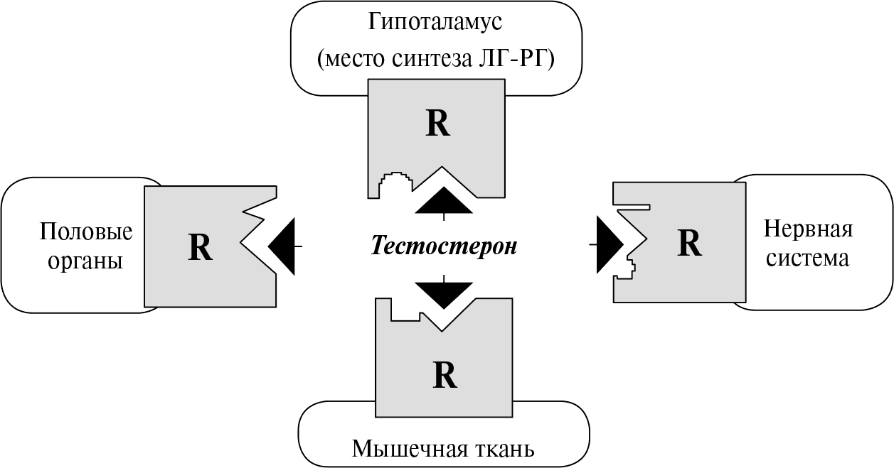 Рис. 2.7. Поливалентность гормонов. Каждый гормон связывается с рецепторами (R), расположенными в клетках разных тканей. Эти рецепторы имеют общее свойство – специфичность, т. е. способность связывать именно данный гормон и не взаимодействовать с другими гормонами, имеющими схожую структуру. Рецепторы для одного и того же гормона, находящиеся в разных тканях, несколько отличаются по своей специфичности. Эти различия и являются биологической основой для создания лекарственных препаратов путем модификации естественных гормонов. Побочные эффекты, обусловленные взаимодействием с остальными тканями, у каждого из таких препаратов сведены к минимуму, поскольку его молекула модифицирована так, чтобы она связывалась только с рецепторами той ткани, для влияния на которую предназначена. Абсолютно полной специфичности достичь не удается, поэтому анаболики, чье действие направлено на мышечную ткань, влияют и на гипоталамус, где они тормозят синтез гонадолиберина (ЛГ-РГ), что и приводит к расстройству репродуктивной функции