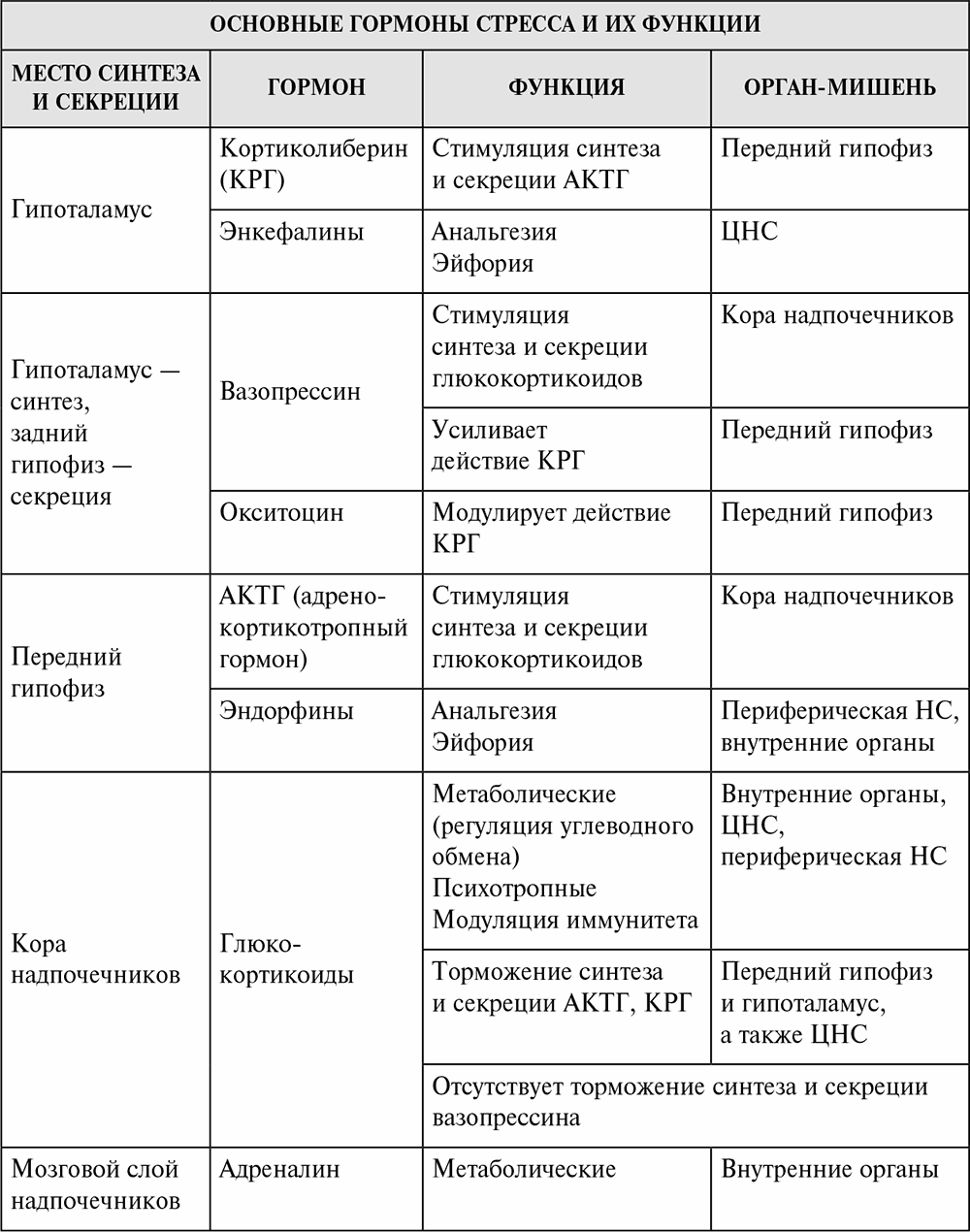В 1912 г., до публикации работ Уолтера Кеннона, русский врач В. Н. Сперанский писал, что «существуют ЭМ-гормоны и вещества, поступающие в кровь из пищи, присутствие которых в крови в определенном количестве обязательно для нормального течения психических процессов»[119]. ЭМ-гормонами Сперанский называл гипотетические гуморальные агенты, выделяющиеся при эмоциях и регулирующие психику человека. В настоящее время хорошо известно, что многие гормоны регулируют психические реакции и состояния. Сперанский прозорливо предсказал психотропный эффект производных прогестерона и дезоксикортикостерона: «ЭМ-гормоны представляют собой главным образом дериваты гормонов». Все основные стрессорные гормоны, к которым принято относить гормоны оси «гипоталамус – гипофиз – надпочечники» (гипофиз-адреналовая система), непосредственно влияют на психику, т. е. обладают психотропным эффектом. Прямое влияние на психические процессы гормонов доказано в экспериментах, в которых возможность опосредованного влияния, т. е. путем активации других эндокринных систем, сведена к минимуму, например при введении гормонов непосредственно в мозг. Однако на уровне целого организма выделить изолированный эффект отдельного гормона чрезвычайно сложно, поскольку гипофиз-адреналовая система (как и системы других желез и вся эндокринная система в целом) интегрирована многочисленными прямыми и обратными связями. Введение больному гормонального препарата приводит к активации нижележащих отделов и торможению вышележащих отделов в эндокринной системе.