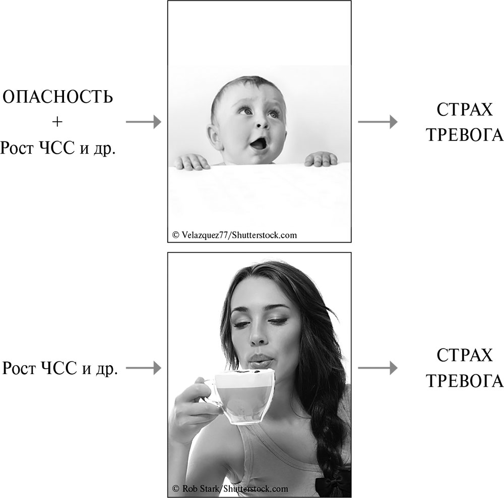 Испытуемым вводят адреналин и просят (для отвлечения внимания) выполнить несложное задание. Затем их просят оценить свое состояние во время выполнения задания. Они отмечают чувство тревоги. Другую группу испытуемых предупреждают, что вводимое им вещество может вызвать легкое сердцебиение, сухость во рту, небольшую дрожь в руках, потливость ладоней. Это все эффекты адреналина, о чем испытуемым, конечно же, не сообщается. Предупрежденные о возможности таких периферических реакций, испытуемые сообщают о различных ощущениях во время выполнения теста, но не говорят о чувстве тревоги. Поскольку наряду с волнением, беспокойством и прочими связанными со стрессом эмоциями сопровождается выделением адреналина, то у каждого человека вырабатывается условный рефлекс, в котором безусловным стимулом являются физиологические реакции на адреналин, а условным – чувство тревоги. В результате учащение пульса, вызванное, к примеру, кофеином, может сопровождаться чувством тревоги (рис. 4.21).