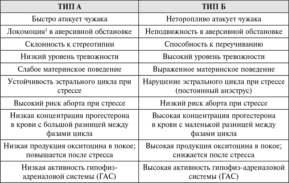 Таблица 6.2. Перечень основных поведенческих и эндокринных особенностей представителей поведенческих типов А и Б у животных[197]