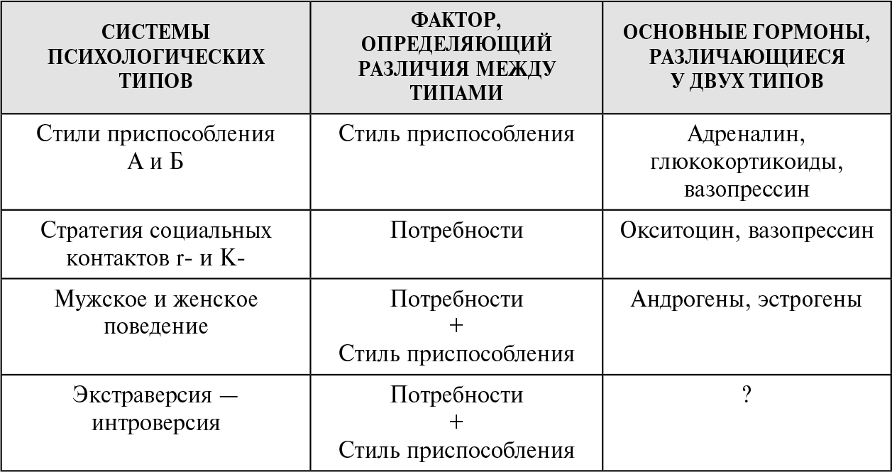 Естественно, эта система типов относится к аналитической, т. е. реальные живые организмы имеют некие промежуточные значения на шкале, одним полюсом которой является абсолютная r-, а другой – абсолютная К-стратегия. Очевидно, что различия между представителями r– и K-стратегий связаны с различием в наборе социальных потребностей. Очень интересно то, что различия между r– и K-стратегиями социальных контактов прямо связаны с врожденными особенностями систем окситоцина и вазопрессина. У представителей К-стратегии активность обеих систем в несколько раз выше, чем у r-стратегов. Самая известная пара психологических типов, которая обсуждается больше всех других, – это альтернатива «мужское и женское поведение». Подчеркнем, то речь идет не о гендерных различиях, т. е. не о различиях вследствие разного воспитания мальчиков и девочек и не о стойких представлениях о роли мужчины и женщины в обществе, а о различиях половых, биологически детерминированных. Половые различия в поведении мужчины и женщины те же, что и в поведении мужских и женских особей подавляющего большинства биологических видов. Подробно они будут разобраны в главе 8. Как будет показано, мужское и женское поведение различается как набором потребностей, так и стилем приспособления, т. е. особенностями стресса. Половые различия в поведении определяются балансом половых гормонов. В табл. 6.3 суммирована роль потребностей, стилей приспособления и гормонов в некоторых системах психологических типов.