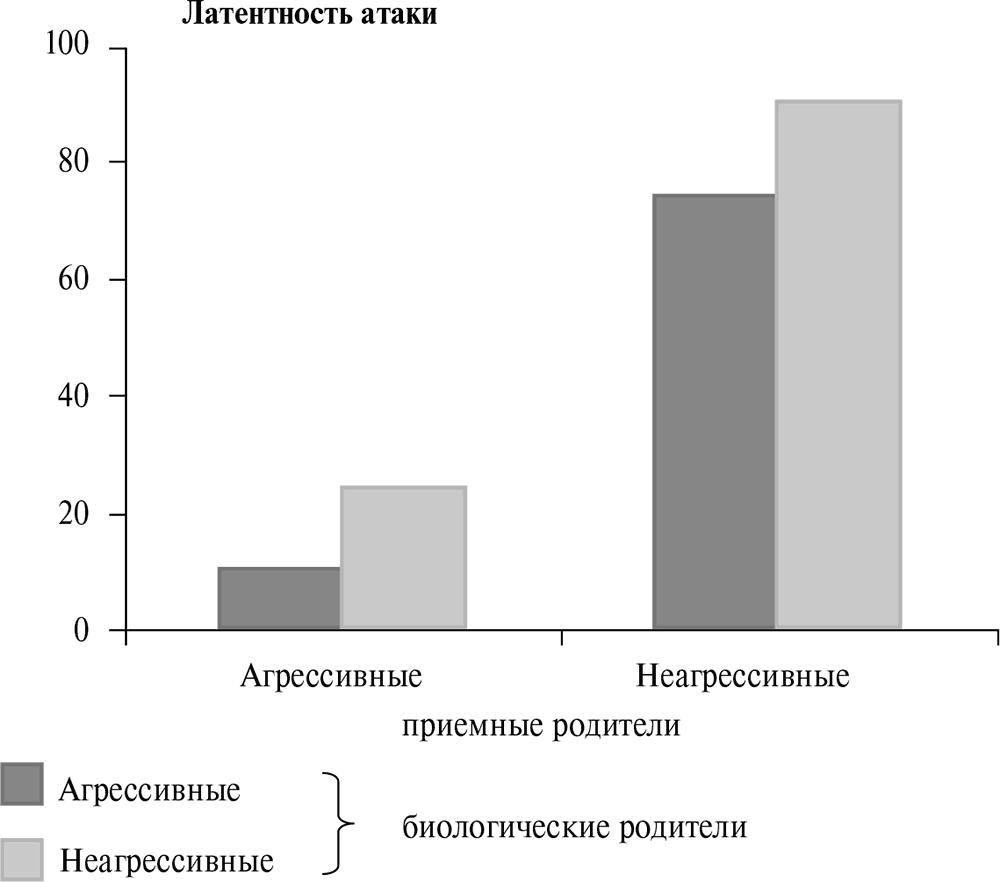 Рис. 7.11. Латентность атаки чужака Агрессивность потомков значительно ближе к агрессивности приемных, а не биологических родителей