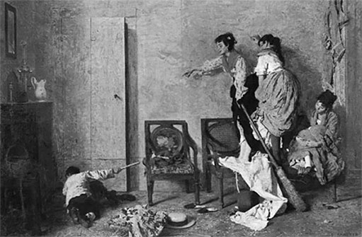 Рис. 8.30. «Мышь» Джакомо Фавретто. Хотя девочки крупнее и, видимо, сильнее брата, но они уклоняются от борьбы с хищником. Мужской пол – расходный, поэтому охота и война – не женские занятия. Кроме того, мужчины лучше женщин действуют в стрессорной ситуации