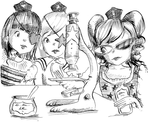 – Ну, – продолжала Марина, – настоящего плана у нас пока нет, но мы отвезем образец этой пузыристой слизи на «Рюшечку», исследуем ее и посмотрим, что можно сделать. С этими словами девочки оставили капитана Литторину успокаивать икающую толпу пиратов и поплыли обратно на «Рюшечку», где тут же направились прямо в каюту Океаны. Там они сгрудились вокруг ее рабочего стола, почти целиком заставленного рядами аккуратно помеченных розовыми этикетками пробирок с разноцветными искрящимися порошками и чашками Петри, в которых росли странного вида лохматые шарики. Прямо посередине стола высился микроскоп. Океана капнула немного слизи от пузырей на тонкое стеклышко и сунула его в микроскоп. – Интересно, очень интересно, – негромко пробормотала она, прижимаясь правым глазом к окуляру. – Что? Что там такого интересного? – нетерпеливо спросила Аква. – Аква, можно тебя попросить задернуть занавески на иллюминаторе? Кажется, я знаю, что это такое. Аква тут же сдвинула короткие плотные занавески, и каюта погрузилась в полумрак. – Да! Я так и думала! – воскликнула Океана. Марина наклонилась ближе к микроскопу. – И что же это, Океана? – Взгляни сама, – ответила Океана, подвигаясь, чтобы ее подруги могли заглянуть в окуляр. Под микроскопом слизь от пузырей поблескивала миллионами крохотных синих и зеленых искорок, похожих на звёздочки. Марина, а потом и Аква полюбовались ими, затаив дыхание. – Это самая очаровательная слизь, которую я видела в своей жизни, – прошептала Аква. – Что это такое? – По цвету и запаху напоминает глубоководную синюю водоросль, но к ней добавлено что‑то еще, что заставляет эту слизь светиться синим и зеленым, – ответила Океана. – Мне кажется, это какие‑то моллюски или рачки.