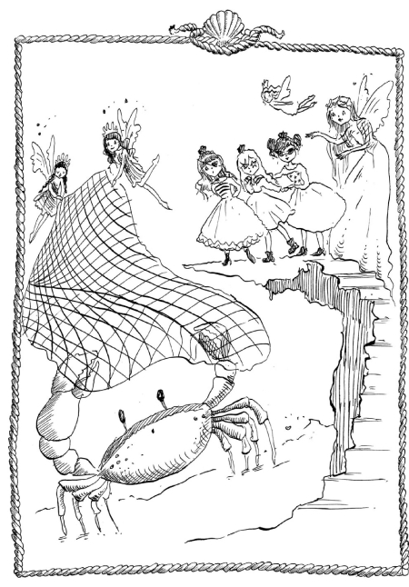 Вскоре путешественницы выбрались на высокий карниз над крабьей пещерой и увидели, как огромное розовое чудовище щелкает на них снизу острыми клешнями. – Как бы нам изловить этого громадного краба? – задумалась Марина вслух. Океана порылась в карманах своей пышной юбки и вытащила тонкую сеть. – Может быть, нам воспользоваться вот этим? – спросила она. – Каждый раз поражаюсь, чего только не найдется в твоих в карманах! – рассмеялась Аква. – У тебя и в самом деле есть нужная вещь на любой случай! – Даже на случай гигантского краба, – сказала Марина, подмигнув подругам. – Но достаточно ли эта сеть прочная, чтобы удержать такого большого краба? – озабоченно спросила Ульвия. – Ей хватит прочности, чтобы удержать даже кашалота! Я сама проводила испытания, – с гордостью сказала Океана. – Отлично! Теперь как бы нам набросить эту сеть на краба? – задумалась Марина. – Мы стоим слишком высоко. Океана взглянула на Ульвию. – Вы не будете против, если мы попросим ваших малюток‑фей помочь нам? – спросила она. Ульвия тут же позвала своих крохотных синих и зеленых фей, и Океана дала им в руки края сети, чтобы ее можно было растянуть в воздухе. – А теперь летите и сбросьте эту сеть на краба! – сказала она им. – А мы спустимся вниз и свяжем его. Феи вспорхнули с растянутой сетью и накрыли ею краба. Тем временем Марина, Аква и Океана спустились вниз по скале, подбежали к сети и затянули ее снизу. Теперь, сколько бы краб ни размахивал и ни щелкал клешнями, вырваться он не мог. Марина посмотрела в большие черные глаза пленника, приподнятые на стебельках над розовым панцирем. – Глядите, – сказала она вдруг, – мне кажется, что краб… – Плачет! – закончила за нее Аква. Большие соленые слезы закапали на каменный пол пещеры, а краб принялся жалобно всхлипывать. – Уааа, уааааа хаааа хаааа, – стонал краб. – Пожалуйста, не обижайте меня! – Так ты можешь говорить? – изумленно спросила Океана. – Да, простите меня… Я вовсе не хотел пугать вас в тот раз. Я всего лишь пытался поговорить с вами, как вдруг вы все исчезли. Девочки и Ульвия переглянулись, не зная, что теперь делать с рыдающим крабом. – А как ты здесь оказался? – задала наконец вопрос Марина.