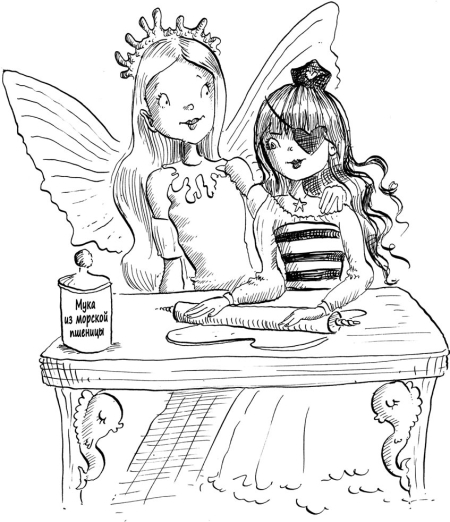 Опустив ладонь к земле, она проследила взглядом, как крабик боком проскользнул в дверь, быстро‑быстро перебирая ножками. Не прошло и пары минут, как он вернулся, неся на спине несколько веточек пурпурно‑красных водорослей. – Мне кажется, это именно то, что вы ищете, – пропищал крабик. – О, молодчина, спасибо! – воскликнула Карисса, нагибаясь и принимая у крабика его ношу. – Полагаю, это именно те водоросли, которые нам нужно смешать с травами Ульвии, чтобы противоядие сработало как следует. Ульвия и Карисса положили травы и водоросли в ступку и толкли их пестиком, пока они не превратились в тягучую лиловую пасту. Феи перелили ее в маленький стеклянный пузырек и заткнули его пробкой. – Ну вот, – с гордостью объявила Карисса, – снадобье для снятия проклятия икоты готово! – Креветки полосатые… – пробормотала Океана про себя. – В чем дело, моя юная пираточка? – спросила Карисса. – Что‑нибудь не так? – Боюсь, что да, – отозвалась Океана. – Понимаете ли, эта бутылочка очень‑очень маленькая, а икающих пиратов в Литториновой Лагуне целые сотни. – Вот так дела, – озабоченно сказала Карисса. – Но у нас не осталось ингредиентов, чтобы приготовить порцию побольше! – Что же нам делать? – воскликнула Аква, и ее глаза налились слезами. – Получается, нам все равно придется отменить ярмарку! – Подождите, кажется, у меня есть идея, – сказала Марина, приподняв брови. – Скажите, сколько этого зелья нужно, чтобы излечить одного пирата? – Всего одна крохотная капелька, – ответила Карисса, и стоящая рядом Ульвия согласно кивнула. Марина указала на большую печь Кариссы и стоящие на полках банки с мукой из морской пшеницы и кристалликами морского сахара. – Давайте испечем ПЕЧЕНЬЕ, – сказала она. – Мы можем замешать противоядие прямо в тесто и наделать достаточно печений, чтобы хватило всем пиратам до единого! – Какая чудесная идея, – поддержала ее Карисса. Марина наклонилась к крабику и спросила: – Можешь пойти и узнать, не согласится ли фея‑шоколадница открыть для нас свою лавочку? Нам понадобится целая куча шоколадной крошки! Малютка‑краб снова шмыгнул за дверь. Только Аква по‑прежнему выглядела озабоченной. – Но, Марина, вспомни, мы не можем предлагать пиратам фейскую еду. Мы ведь знаем, как это опасно. Что, если их всех затянет в королевство фей и они останутся в нем навсегда? Ульвия тихонько рассмеялась. – Не беспокойся, маленькая пиратка, позволь мне поделиться с тобой одним фейским секретом: как только приготовленная феями пища попадет за пределы их королевства, она уже никому не сможет принести вреда. Я обещаю. Аква с облечением улыбнулась, и девочки тут же принялись отмерять нужное количество муки и сахара, а Карисса занялась растопкой печи. Ульвия достала с полки большую миску из морской раковины и поставила ее на прилавок. Карисса смешала в миске муку, морской сахар и противоядие, а потом добавила немного масла. – Теперь осталось только дождаться шоколадной крошки! – сказала Марина. – Ну и куда же запропастился наш малютка‑краб? – спросила Аква. Но прежде чем кто‑то успел ей ответить, краб снова появился на пороге, на этот раз в сопровождении еще нескольких десятков крабов‑носильщиков. И каждый тащил на спине пакетик с шоколадной крошкой! – Я попросил своих друзей помочь мне донести этот груз, – с улыбкой сказал краб, и было видно, что о