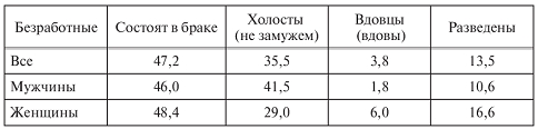 Особенности семейного положения российских безработных видны из табл. 4.9. Большинство среди зарегистрированных (статусных) безработных — женщины, состоящие в браке. Вдовых и разведенных среди безработных женщин в 1,5 раза больше, чем среди мужчин. Среди безработных холостых мужчин значительно больше, чем незамужних женщин. Таблица 4.9. Гендерно-семейные особенности российских безработных на конец 2009 г., %