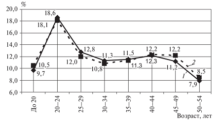 Самый высокий удельный вес среди безработных по возрасту приходится на молодежь 20-24 лет (21,8 %). Здесь тендерный признак не играет существенной роли (22,3 % среди мужчин, 21,2 % среди женщин). Общая динамика безработных по возрасту в тендерных группах представлена на рис. 4.3.