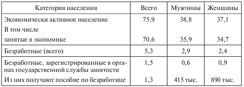 Рис. 4.3. Возрастная и гендерная структура безработных россиян: 1 — мужчины; 2-женщины Группой наиболее высокого риска и угрозы стать безработным являются молодые люди в возрасте от 20 до 29 лет. Наиболее высокий рост безработицы характерен для сельской молодежи (в 2 раза выше, чем в 1992 г.). Как статистически соотносятся между собой в категории «экономически активное население» две составляющие объекта экономической социологии «занятые» и «безработные», показано в табл. 4.10. В финансово-банковской сфере рынок труда до финансового кризиса 1998 г. был очень динамичным и быстро расширялся, но после финансового кризиса он резко сократился, серьезно деформировался, что сопровождалось сокращением числа занятых (особенно в банковском секторе), усилением нисходящей социальной мобильности специалистов. Социальные негативные последствия безработицы связаны с переходом индивида из одного статусного состояния (занятого трудовой деятельностью) в другое (безработный) проявляются: в виде усиления депрессии, снижения уровня социального оптимизма, разрыва устоявшихся коммуникативных связей, изменения ценностных ориентаций, перехода в маргинальное состояние. Главное втом, что индивид лишается материальной базы своего развития, падают уровень и качество его жизни. Таблица 4.10. Структура экономически активного населения России в 2008 г., млн человек