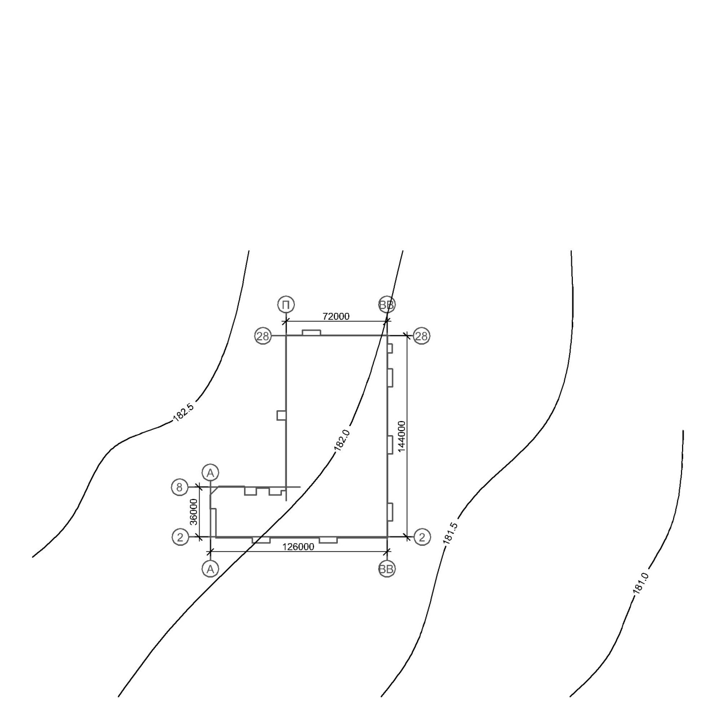 Расчет черных отметок: Hч1=182,0+0,5∙0,728= 182,36м; Нч2=181,5+0,5∙0,978= 181,99м; Нч3=181,5+0,5∙0,443= 181,72м; Нч4=182,0+0,5∙0,224= 182,11м; Нч5=182,0+0,5∙0,401= 182,20м; Нч6=182,0+0,5∙0,381= 182,19м; Нч7=182,0+0,5∙0,487= 182,24м; Нч8=182,0+0,5∙0,499= 182,25м; Нч9=182,0+0,5∙0,352= 182,18м; Нч10=182,0+0,5∙0,298= 182,15м; Нч11=182,0+0,5∙0,185= 182,09м. Расчет красных отметок: Hкр=Hкрmax-i∙l (1.2) Hкр- необходимая красная отметка, м; Hкрmax-старшая красная отметка, м; i-уклон спланированной поверхности, i=0,01; l-длина стороны здания, м. Принимаем Нчmax = Нкрасн. =182,36м, тогда: Нкр1=182,36м; Нкр2=182,36-0,01∙72=181,64м; Нкр3=181,64-0,01∙143,4= 180,21м; Нкр4= 180,21+0,01∙121= 181,42м; Нкр5= 181,42+0,01∙21,5= 181,64м; Нкр6= 181,64+0,01∙4= 181,68м; Нкр7= 181,68+0,01∙9,5= 181,77м; Нкр8= 181,77+0∙6 = 181,77м; Нкр9= 181,77-0,01∙18= 181,60м; Нкр10= 181,60-0,01∙6= 181,54м; Нкр11= 181,54-0,01∙30= 181,24м.