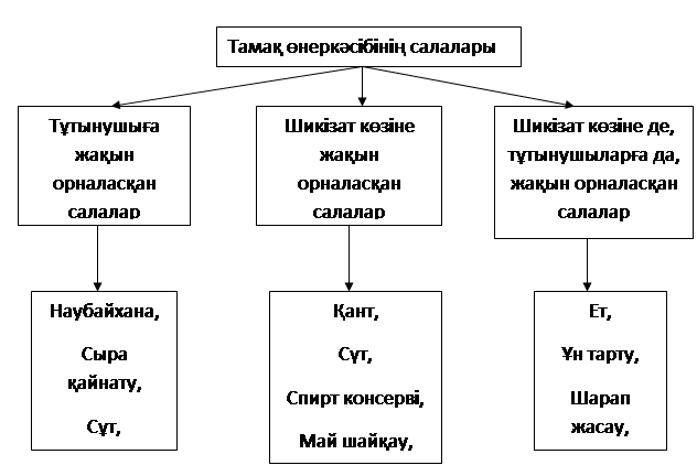 2. Еліміздегі көмір кен орындарын картадан көрсету, сипаттама беру. ------- 1.Тамақ өнеркәсібі - халықтық тағамға деген сұранысын қанағаттандырады. Біздің елімізде тамақ өнеркәсібінің ет,ұн тарту,жарма,қант өнімдері,балық,кондитер,шарап жасау,т.б.салалары дамыған.Ауыл шаруашылығы – тамақ өнеркәсібі негізгі шикізат көзі болып табылады. Тамақ өнеркәсібі өнімдері еліміздегі азық – түлік қорының 90 % - ын құрайды. Қазіргі кезде тамақ өнімдарін шығаратын кәсіпорындар заман талабына сай жаңа техникамен және технологиямен жабдықталған., Ауылшаруашылық шикізаттарынан ұзақ мерзімге сақталатын өнім дайчндалады. Ал тез бұзылатын тамақ өнімдер тамақ өндірісі кәсіпорындағы қуаты жоғары тоңазтқыштарда сақталады. Тамақ өнімдерінің қалдықтары қаитадан ауыл шаруашылығында пайдаланады. Тамақ өнеркәсібінің базасы шикізатты пайдалану сипатына, түріне қарай үш топқа бөлінеді; өсімдік шаруашылығының шикізаттарымен, мал шаруашылығының шйкізаттары, өндіріс шикізаттары (тұз, өндіру, минералды сулар, балыұ аулау, теңіз өнімдері). Тамақ өнеркәсібі салаларын орналастыруға әсер етуші негізгі факторлар - шикізат көздері және тұтынушылар. Осы факторлардың әсер ету дәрежесіне қарай тамақ өнркәсібін үш салаға бөлуге болады (9 сызбанұсқа).