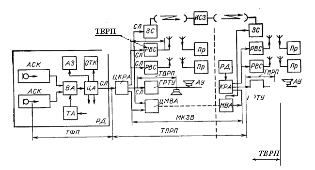 Рис. 1.1. Структурна схема звукового мовлення. Формування і доведення програм до слухачів здійснюється за допомогою комплексу технічних засобів, які утворюють електричний канал звукового мовлення(ЕКЗМ). По ЕКЗМ сигнали звукового мовлення передаються з виходу мікрофона до антени передавача чи абонентської розетки тракту провідного мовлення. Електричний канал звукового мовлення складається з тракту формування програм(ТФП), тракту первинного розподілу програм(ТПРП) та тракту вторинного розподілу програм(ТВРП).