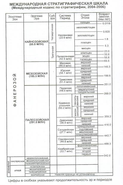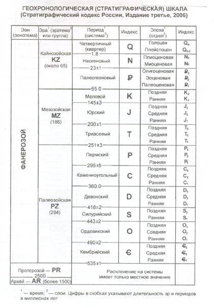 Вся геологическая история Земли, (фиксируемая в минералах и горных породах), делится на две неравные части: более древний и более продолжительный криптозой (время скрытой жизни), или докембрий, охватывающий первые 3,5 млрд. лет геологической истории Земли, и значительно более короткий фанерозой (время явной жизни), к которому относят последние 540 млн. лет. Граница фанерозоя и докембрия постоянно уточняется, колеблясь от 590 до 542-535±1 млн. лет в наиболее современном варианте шкалы. Нижняя граница докембрия с появлением новых данных также может изменяться, смещаться вниз, в сторону удревнения. Согласно современной международной стратиграфической (геохронологической) шкале (табл. 7) самыми крупными ее подразделениями являются эонотемы (эоны). Их выделяют две (два) в докембрии – архей и протерозой, третья эонотема (третий эон) - фанерозой – включает в себя более молодые отложения, от кембрийских до четвертичных включительно. Эонотемы (эоны) делятся на эратемы (эры): четыре – в архее, три – в протерозое и три - в фанерозое. Эратемы (эры) фанерозоя делятся на системы (периоды), отделы (эпохи), ярусы (века). В современном варианте стратиграфической шкалы докембрия (Стратиграфический кодекс России, Издание третье, 2006, Приложения) архей и протерозой получили новый статус более крупного подраздела – акротем, в пределах каждой из которых выделяются эонотемы: нижне- и верхнеархейские и нижне- и верхнепротерозойские (см. табл.8). Верхний протерозой делится нарифей и венд (последний - в ранге системы). Нижний и верхний архей и нижний протерозой и рифей подразделяются на эратемы, название которых соответствуют названиям толщ пород соответствующего возраста. Фанерозойская эонотема подразделяется на три эратемы: палеозойскую, состоящую из шести систем, мезозойскую, состоящую из трех систем, и кайнозойскую (три системы). Название системам (периодам) обычно присваивалось по наименованию местности, где породы соответствующего возраста были впервые выделены и наиболее полно описаны. Так, кембрийский период носит старое название п-ва Уэльс; ордовикский и силурийский получили название по имени древних племен, живших в тех районах Англии, где эти отложения были описаны; девонский период был назван по графству Девоншир опять в Англии; пермский – по Пермской губернии в России; юрский – по Юрским горам в Швейцарии. Исключение составляют каменноугольный (карбоновый) и меловой периоды, названные по характерным породам, их слагающим, а также триасовый период, название которого произошло от объединения трех толщ в Европе, последовательно залегающих одна над другой. Палеогеновый и неогеновый периоды, ранее входившие в состав третичного периода, свои названия получили от местоположения в его составе: древний и молодой. Только название «четвертичный» сохранилось с XVIII века. Все подразделения геохронологической и стратиграфической шкал ранга «период-система» обозначаются по первой букве латинского наименования, например девон - D, карбон – С, пермь – Р и т.д. (табл.6,7). Более мелкими единицами, чем период (система), в шкале являются эпохи (отделы). Их бывает две (два) или три с соответствующими названиями. Эпохи делятся на раннюю, среднюю и позднюю, отделы - – на нижний, средний и верхний; обозначаются цифрами – 1, 2, 3, которые ставятся справа от индекса периода или систе