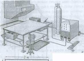 Рис. 3.15. Сварочный пост для ручной дуговой сварки в среде инертных газов: а - общий вид; б -план: 1 - вентиляция; 2 - рабочий стол; 3 - ящик для электродов; 4 -ящик для деталей; 5 - диэлектрический коврик; 6-го-релка; 7 - газовый рукав; 8 - стул; 9 - газовый баллон; 10 - прямой провод; 11 -источник питания дуги; 12 - заземление; 13 - обратный провод; 14 - ящик для отходов