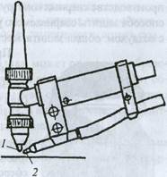Рис. 3.20. Схема подачи защитного газа в зону сварки через сопло и насадку - 1\ 2 - газовая линза, обеспечивающая ламинарность потока газа