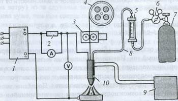 Рис. 3.22. Схема постадля сварки плавящимся электродом в углекислом газе: / — источник питания дуги; 2 — шунт; 3 - механизм подачи проволоки; 4 -кассета с проволокой; 5 - ротаметр; 6 - редуктор; 7 - баллон; 8 - рукав (шланг); 9 - система циркуляционного охлаждения; 10 — горелка