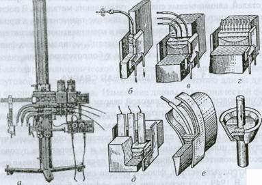 б - сварка одним электродом металла толщиной до 60 мм; в – трёхфазная сварка металла толщиной 450 мм тремя электродами с возвратно-поступа-тельным движением; г - многоэлектродная сварка металла практически неограниченной толщины; д - сварка пластинчатыми электродами; е - сварка плавящимся мундштуком; ж - контактно-шлаковая сварка стержней Необходимая для осуществления шлакового процесса энергия получается от источника питания с жёсткой характеристикой переменного или постоянного тока, подсоединяемого к основному металлу и плавящемуся электроду (электродам), вводимому в зазор между свариваемыми кромками и погруженному в шлаковую ванну. Электрод располагают посередине шлаковой ванны или перемеща-ют в зазоре от одной поверхности свариваемых деталей к другой. Ток к электроду подводится при помощи мундштука. Проходя через шлаковую ванну, ток нагревает ее до температуры ~2000 °С, которая выше температуры плавления основного и электродного металлов. Шлак расплавляет кромки основного металла и электрод, который подается в шлаковую ванну со скоростью, равной скорости его плавления. Расплавленные электродный и основной металлы стека-ют на дно шлаковой ванны, образуя сварочную (металлическую) ванну. По мере удаления источника нагрева происходит кристаллизация металла сварочной ванны. Расплавленный шлак, находящийся над металлической ванной, достаточно надежно защищает метапл от воздействия воздуха. По мере заполнения зазора между свариваемыми кромками мундштук при помощи специального привода передвигается вдоль свариваемого изделия. Шлаковая ванна, наведенная в начале сварки, по мере формирования шва перемещается от его начала по детали к концу; при этом, соприкасаясь с охлаждёнными ползунами, образует на них тонкую шлаковую корку, исключая непосредственный контакт расплавленного металла с поверхностью ползуна. Расход флюса при этом способе сварки невелик и не превышает 5 % массы наплавленного металла. Ввиду малого количества шлака легирование наплавленного металла происходит в основном за счёт электродной проволоки. При этом доля основного металла в сварном шве может быть снижена до 10-20 %. По сравнению со сварочной дугой шлаковая ванна является ме-нее концентрированным источником теплоты, поэтому ЭШС харак-теризуется более медленным нагревом и охлаждением. Значительное время пребывания металла в расплавленном состоянии способствует улучшению условий удаления газов и неметаллических включений из металла шва. Электрошлаковый процесс протекает устойчиво даже при плот-ностях токау' ~ 0,1 А/мм2 (при ручной дуговой сварке покрытыми электродами = 10-30 А/мм2; при автоматической под слоем флюса у = 200 А/мм2; при сварке плавящимся электродом в защитных газах 7 = 400 А/мм2), поэтому возможно использование электродов достаточно большого сечения. Электрошлаковую сварку, как правило, ведут при вертикальном положении изделий. Зеркало сварочной ванны, как и при сварке в нижнем положении, расположено в горизонтальной плоскости, а перемещение расплавленного электродного и основного металлов происходит в направлении сил тяжести. Обычно сварка начинается в прикреплённом к нижней части сты-ка металлическом кокиле длиной 50-100 мм, где возбуждается дуговой процесс. Для того чтобы вывести шлаковую ванну и предотвратить образование усадочных 