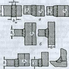 Рис. 3.27. Виды соединений, выполняемых электрошлаковой сваркой: а-стыковые; б-тавровые; в-угловые; 5-толщина металла; Ь - ширина зазора; Ьш - ширина шва