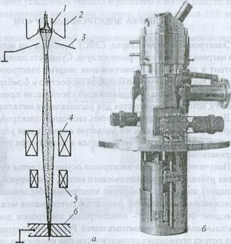Рис. 3.29. Схема устройства электроннолучевой пушки (а) и общий вид пушки ЭЛТП-60/30 (б)