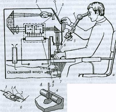 Рис. 3.32. Установка для свар-ки лазером (а) и схема образо-вания соединения при лазерной сварке (б); а: 1 - осветитель (фокусировка луча по месту сварки); 2 - рубин (активное вещество); 3 - пульт управления- 4 - микроскоп; 5 - шторка; 6 - свариваемые детали; 7 - манипулятор (настройка расположения деталей); 5 - газоразрядная импульсная лампа; б: 1 - привариваемые детали; 2-микрометр; 3 -луч лазера (площадь пятна | нагрева ~ 10'5 мм2); 4 - сварная точка