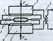 3.7. КОНТАКТНАЯ СВАРКА Контактная сварка объединяет болыиую группу способов сварки, наиболее распространённые из которых - точечная, шовная и стыковая. 3.7.1. Точечная сварка Основной тип соединения свариваемых деталей при точечной сварке — нахлёсточное (рис. 3.34). Свариваемые детали 1 (рис. 3.35) собирают внахлёстку и зажима-ют усилием Рп между двумя электродами 2, подводящими ток боль-шой силы (до нескольких десятков кА) к месту сварки от источника электрической энергии 3 невысокого напряжения (обычно 3-8 В). Детали нагреваются кратковременным (0,01-0,5 с) импульсом тока до появления расплавленного металла в зоне контакта 4. Нагрев со