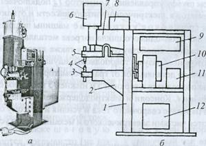 Рис. 3.36. Общий вид машины точечной сварки (а) и её основные узлы (б)