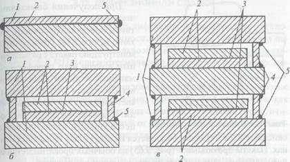 Рис. 3.64. Конструкции пакетов для сварки прокаткой: 1 - основной слой; 2 - плакирующий слой; 3 - разделительный слой; 4 - технологическая планка; 5 - сварной шов