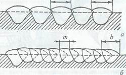 Рис. 3.79. Влияние шага наплавки на долю основного металла в поверхностном слое: а - большой шаг; б-малый шаг; т - шаг наплавки; b - ширина валика