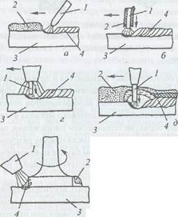 Рис. 3.81. Схемы основных способов дуговой наплавки: а — угольным (графитовым) электродом / с расплавлением сыпучего зернистого наплавочного сплава 2; б - ручной дуговой с покрытым электродом / и с легирующим покрытием 2; в- неплавящимся вольфрамовым электродом / в защитных инертных газах с подаваемым в дугу присадочным прутком 2; г — плавящимся электродом проволокой 1 в защитных (инертных, активных) газах; д - механизированная (автоматическая, полуавтоматическая) дуговая с плавящейся электродной (обычно легированной) проволокой / под флюсом 2; е - плавящейся лентой / катаной, литой или прессованной из порошков в защитных газах или под флюсом; ж - расплавлением плазменной струёй плазмотрона / предварительно наложенного литого или спечённого из порошков кольца 2 наплавочного материала; 3 - наплавляемое изделие; 4 - наплавленный металл.