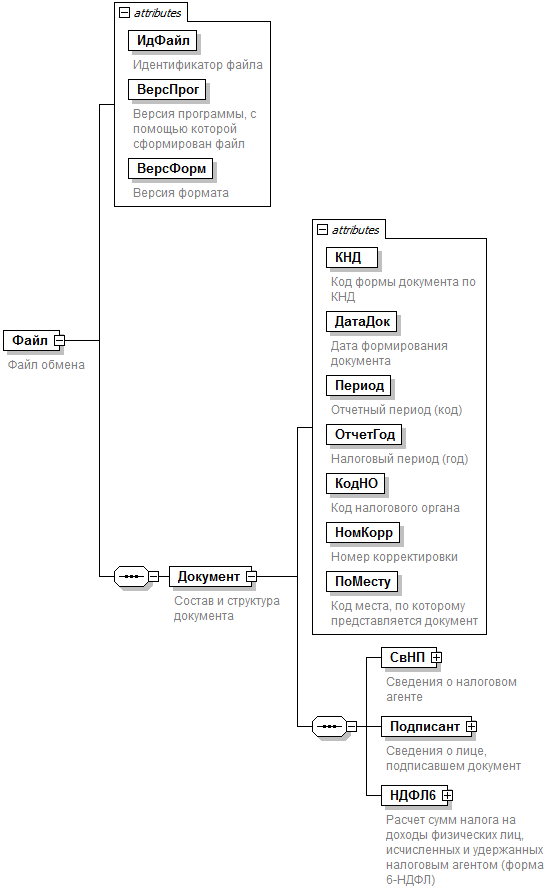 Формат представления расчета сумм налога на доходы физических лиц, исчисленных и удержанных налоговым агентом, в электронной форме I. ОБЩИЕ СВЕДЕНИЯ 1. Настоящий формат описывает требования к XML файлам (далее – файлам обмена) передачи в электронной форме расчета сумм налога на доходы физических лиц, исчисленных и удержанных налоговым агентом, (по форме 6-НДФЛ) в налоговые органы. 2. Номер версии настоящего формата 5.01, часть CLII. II. ОПИСАНИЕ ФАЙЛА ОБМЕНА 3. Имя файла обмена должно иметь следующий вид: R_Т_A_K_О_GGGGMMDD_N, где: R_Т – префикс, принимающий значение NO_NDFL6; A_K – идентификатор получателя информации, где: A_K – идентификатор получателя информации, где: A – идентификатор получателя, которому направляется файл обмена, K – идентификатор конечного получателя, для которого предназначена информация из данного файла обмена[1]. Каждый из идентификаторов (A и K) имеет вид для налоговых органов – четырехразрядный код (код налогового органа в соответствии с классификатором «Система обозначения налоговых органов» (СОНО); О – идентификатор отправителя информации, имеет вид: для организаций - девятнадцатиразрядный код (идентификационный номер налогоплательщика (далее - ИНН) и код причины постановки на учет (далее - КПП) организации (обособленного подразделения); для физических лиц – двенадцатиразрядный код (ИНН физического лица, при наличии. При отсутствии ИНН – последовательность из двенадцати нулей); GGGG – год формирования передаваемого файла, MM – месяц, DD – день; N – идентификационный номер файла (длина – от 1 до 36 знаков. Идентификационный номер файла должен обеспечивать уникальность файла). Расширение имени файла – xml. Расширение имени файла может указываться как строчными, так и прописными буквами. Параметры первой строки файла обмена Первая строка XML файла должна иметь следующий вид: <?xml version ="1.0" encoding ="windows-1251"?> Имя файла, содержащего XML схему файла обмена, должно иметь следующий вид: NO_NDFL6_1_152_00_05_01_xx, где хх – номер версии схемы. Расширение имени файла – xsd. XML схема файла обмена приводится отдельным файлом и размещается на сайте Федеральной налоговой службы. 4. Логическая модель файла обмена представлена в виде диаграммы структуры файла обмена на рисунке 1 настоящего формата. Элементами логической модели файла обмена являются элементы и атрибуты XML файла. Перечень структурных элементов логической модели файла обмена и сведения о них приведены в таблицах 4.1-4.18 настоящего формата. Для каждого структурного элемента логической модели файла обмена приводятся следующие сведения: наименование элемента. Приводится полное наименование элемента[2]; сокращенное наименование (код) элемента. Приводится сокращенное наименование элемента. Синтаксис сокращенного наименования должен удовлетворять спецификации XML; признак типа элемента. Может принимать следующие значения: «С» – сложный элемент логической модели (содержит вложенные элементы), «П» – простой элемент логической модели, реализованный в виде элемента XML файла, «А» – простой элемент логической модели, реализованный в виде атрибута элемента XML файла. Простой элемент логической модели не содержит вложенные элементы; формат элемента. Формат элемента представляется следующими условными обозначениями: Т – символьная строка; N – числовое значение (целое или дробное). Формат символьной строки ук