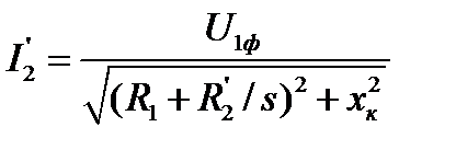 Вывод: 1. Естественные электромеханическая и механическая характеристики сняты при номинальных параметрах двигателя. Имеют нелинейный характер, расположены в первом квадранте. Характерные точки электромеханической характеристики: 1) S=0, ω=ω0, I2`=0,I1=I0 – точка идеального холостого хода. 2) S=1, ω=0, I2’=Iкз`=Iп – точка короткого замыкания. 3) S=-R2`/R1, ω=ω0(1-S1), I`2=Imax=Uф/Xk – точка максимального значения тока ротора, лежащая в области отрицательных скольжений. 4) S→±∞, ω→∞, I2`→ Характерные точки механической характеристики: 1) S=0, ω=ω0, M=0 – точка идеального холостого хода. 2) S=1, ω=0, M=Mкз=Мп – точка короткого замыкания. 3) S=SкрДв,M=MкрДв, S=-SкрГ, M=-MкрГ – точки экстремума. 4) S→±∞, ω→∞, M→0 – асимптота механической характеристики, которой является ось скорости. Механическую характеристику можно разделить на два участка 1-й участок – практически линейный (от скорости идеального холостого хода ω0 до скорости при Мк) 2-й участок – нелинейный (от скорости при Мк до скорости ω→-∞).