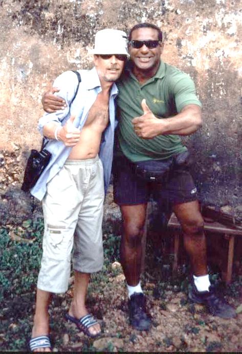 Дуэт, аккомпанируя, снова делал круглые глаза, не ожидав от нас такой осведомлённости о кубинском репертуаре 30-летней давности. Конечно, мы отвалили ребятам хорошие чаевые к взаимному удовольствию. Впечатление от Дельфинария и плавания с дельфинами словами передать очень трудно. Это была моя заветная мечта…. Они катали меня, подставляя плавники, проделывали надо мной различные трюки, под конец - два дельфина, упершись носами мне в ступни, выбросили меня метра на три из воды. Под конец они подплывали ко всем поочередно и целовали на прощание. Кроме того, дрессировщиками показывается шоу-программа с дельфинами, круто…. Мне кажется они умнее и добрее людей! Всё происходящее пишется на DVD-диск, который можно купить после шоу. Конечно же, я купил, плюс отдельно три больших фото, на которых дельфины нас целуют на прощание. Я просил ещё сеанс (выброс из воды) за отдельную плату, но за нами была уже очередь других туристов. Вернулись в отель, от распиравших впечатлений и нахлынувшей любви к дельфинам, я напился в баре, лёг на лежак у бассейна и вырубился до глубокого вечера. Разбудила жена с видеокамерой. Кубаши помогли мне добраться до номера. Жена снимала всё это явление. Джип-сафари. По телефону в номере кто-то по-русски, но с акцентом сообщает – типа «карета подана», выхожу на центральный вход у ресепшена, стоят два джипа-чароки с открытым верхом, рядом - здоровенный улыбающийся негр. Понимаю, это инструктор-экскурсовод. Я ему: «Джип-сафари? Русо туристо! (чуть не добавил – «облико аморале»)», и гордо ткнул себя пальцем в грудь. От его ответа у меня наверно были очень смешное выражение лица: «Да я сам русский в душе!». Как выяснилось, Луис окончил Калининградскую мореходку, женился на русской из Воронежа, а на Кубе у него родители и сезонный бизнес – организация и проведение джип-сафари. К нам присоединилось еще пятеро русскоязычных туристов. Сажусь за руль с женой на один из джипов (удостоверение никто не спрашивает, хотя я его прихватил на всякий случай, а до моего амбре никому нет дела) и едем вместе с другими по Кубе. По автостраде – 140 км/час, потом по грунтовке среди полей и зарослей, кое-где короткие остановки, где Луис рассказывает различные интересные подробности о местности, растениях, животных. В общем, о чём спросишь, о том и расскажет. Далее в Матанзас на касу (дом) Луиса, там знакомимся с его родными, Луис угощает кубинской водкой, кофеём. Снова по машинам, катаемся по городу (почему-то кубаши обращают на наш эскорт внимание). Останавливаемся у небольшой лавки, где на наших глазах интересной конструкцией выжимают сок из сахарного тростника, который мы пьём. Луис поясняет: такой сок полезен для потенции. Я при жене демонстративно засасываю большой стакан. Всем весело. Едем в красивый высокий каньон с рекой, пересаживаемся на скутера и шарим по ней на приличной скорости. Я управлял скутером впервые, классно! Жена держалась сзади за меня и даже не визжала. Луис остановил нас в таком месте реки, где по пояс верхний слой воды прохладный, а нижний очень тёплый. Поплавали, ощущение очень интересное и необычное. Оказывается в реке-перевертыше верхний слой потока пресной, а нижний солёный и идёт с прогретого океана, потому такой эффект. Снова на скутера, возвращаемся к машинам, там же в баре перекусываем омарами и пивом. Я еще конечно взял махито и ко