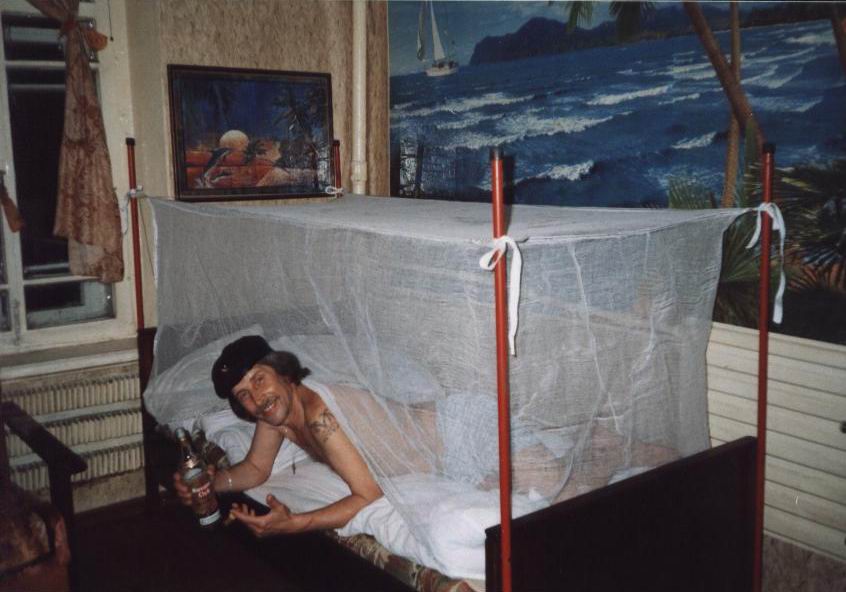 Часть 2. «Подготовка к наступлению» Вернувшись из «разведки» и обуреваемый впечатлениями, я еще долго пребывал под кубинским психозом, вплоть до «старого» Нового года. Раздаривал сувениры, 2008 год встречал с «Гавана Клуб», «чегеваровским» беретом на голове и кубинской сигарой в зубах. В бильярдной разместил под «иконостасом» кубинский флаг, деревянную статуэтку дельфина и фотки с дельфинария. Если учесть, что в бильярдной я наклеил фотообои во всю стену в виде морского заливчика с пляжем и пальмами, то можно смело представить – с Кубы я еще не вернулся. Красота! Кроме того, примерно такой же фотообой, но с яхтой, я поместил над своей кроватью в компьютерной комнате. Позднее сходил в аптеку, накупил марли, принёс от матери швейную машинку и к лету сшил накомарник по образу и подобию армейского, который после замачивания в крахмале и просушки водрузил на кровать. Не снимал его до конца лета, зато спал с открытыми окнами, без одеяла и ни одного укуса «мессершмитов»! А у меня с Кубы с ними особые отношения… Как там, на Узле связи было. Пологи накомарника заправляешь под матрас, оставляя посередине маленький лаз, головой вперед просовываешься в него, закупориваешься, зажигаешь спичку и осматриваешься. И если есть хоть один комар, сидящий чёрной бякой на белой марле - убиваешь его! Иначе – не уснешь, укусит – не заметишь, а потом такой чёс! А мы ведь жили впритык к манговой роще, да еще рядом бассейн с водой и лягушками, которые с комарами, видимо, не справлялись. Кроме того, не дай бог во сне коснуться голой частью тела марли, к утру так раздует места укусов! Это отработанная классическая техника отхода ко сну. Когда друзья приходили ко мне покатать шары, видели все эти мои выкрутасы в бильярдной и компьютерной, то молча улыбались. Но я-то по глазам видел, что у них наворачивается фраза: «У Сани на пенсии точно появился конкретный бзик на почве Кубы». Зато мамке и жене всё нравится. Эх, жаль батька не дожил!