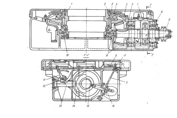 В роторі, представленому на рис. 7.2, застосовується циркуляційна система змащування підшипників і зубчатої пари з допомогою плунжерного насоса 16, що має привід від ексцентричної втулки 15 на швидкохідному валі 9. Насос забирає масло з масло відстійника А в станині ротора і по трубках 5 через кран 17 подає його на верхній підшипник 4. Частина масла стікає на зубчатий вінець і змащує зубчасту пару, а інша частина проходить по каналах і поступає на нижній підшипник 10, з якого стікає в масляну ванну. В роторі УР-760 використовується стіл збірної конструкції, який складається з пустотілої втулки 1, що з'єднується з диском 3 болтами 2 з потайною головкою. Замість стакана використовуються запобіжні гільзи 6 і 8. Швидкохідний вал 6 (див. рис. 7.3) монтується в стакані 7 на спарених радіально-упорних конічних роликопідшипниках 5, розміщених зі сторони шестерні 1, і на радіальному роликовому підшипнику 9, встановленому на протилежному кінці вала. Конічні підшипники мають високу жорсткість в радіальному і осьовому напрямках. Дзеркальне розміщення конічних підшипників забезпечує точну двохсторонню фіксацію вала, необхідної для надійної і безшумної роботи передачі. Роликовий підшипник - плаваючий і забезпечує осьове переміщення вала при тепловій деформації. У фіксованій опорі внутрішнє кільце підшипника закріплене між заплічиком вала і маслорозбризкуючим кільцем 4, яке впирається в торець шестерні. Зовнішні кільця підшипників 5 і 9 закріплені між внутрішнім 3 і зовнішнім 11 фланцями стакана за допомогою металічних прокладок і дистанційної втулки 8. Внутрішнє кільце роликового підшипника кріпиться між заплічиком вала і кільцем 10, затягнутими торцевим фланцем 16 через проміжні деталі 13, 14, 15 і дистанційне кільце 17.