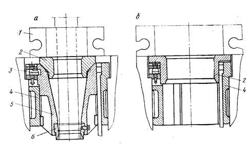Зворотне переміщення клинів здійснюється при подачі стиснутого повітря в штокову порожнину пневмоциліндра і повороті важеля 10 за годинниковою стрілкою. Важелі 3 забезпечують переміщення клинів в радіальному напрямку при підніманні і опусканні клинів. Відношення пліч важеля 10 вибирається залежно від ходу поршня пневмоциліндра і необхідної висоти підйому клинів. Вага бурильної колони, що утримується клиновим захватом, обмежується допустимим контактним тиском між плашками і тілом труби. Для зменшення контактних тисків користуються видовженими клинами і спеціальними плашками, які охоплюють трубу з мінімальним зазором між їх поздовжніми торцями. В деяких конструкціях замість трьох використовують шість клинів, що сприяє більш рівномірному розподілу контактних тисків. При недостатній утримуючій здатності клинові захвати замінюються підкладним кільцем (рис. 7.6, а) для встановлення елеватора або підкладними клинами, які утримують трубу за торець муфти. Для спуску обсадних труб, діаметр яких більший від діаметра конусної втулки, використовується підкладне кільце, яке замінює клини і конусну втулку (рис. 7.6, б).