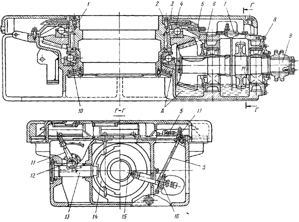 Все роторы имеют типовую схему конструкции и представляют собой конический редуктор с ведомым валом, выполненным в виде полого вертикального цилиндра. Составные части ротора: станина, вращающийся стол, быстроходный вал, коническая зубчатая пара, основная и вспомогательная опоры (см. рис.4). Станина – литая из конструкционных нелегированных сталей, имеет расточки для размещения быстроходного вала и стола ротора. Толщина стенки станины 15-30 мм. Стол – стальная полая отливка с наружным диском, предназначенным для прикрытия вертикальной расточки станины. Верхняя часть стола имеет квадратное углубление для размещения разъемного вкладыша. Вкладыш применяется для установки в него квадратных или роликовых зажимов ведущей трубы, вставляемых при бурении, или клиньев для удержания бурильных труб при спускоподъемных операциях. На стол ротора напрессовывается коническое колесо, которое садится в вертикальной расточке станины на основную и вспомогательную опоры. В качестве опор преимущественно используются упорно-радиальные шарикоподшипники. Основная опора предназначена для восприятия нагрузок от веса стола и колонны труб, удерживаемой клиньями при СПО. Вспомогательная опора воспринимает усилие от предварительного осевого натяга подшипника и случайных нагрузок от ударов и трения при подъеме труб, долота и т.д. Подшипники вы бираются по диаметру проходного отверстия стола ротора. Основная опора имеет шарики подшипника диаметром 63,5 -101,6 мм, вспомогательная - диаметром 38,1-47,8 мм. Варианты относительного расположения основной и вспомогательной опор выбираются, исходя из необходимости обеспечения лучших условий их смазки, которые могут изменяться в зависимости от размеров ротора.