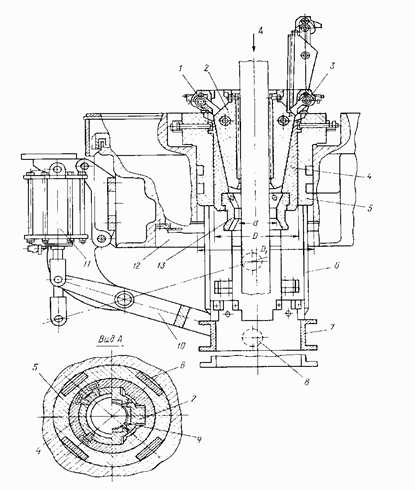 Рис.6.Пневматический клиновой захват: 1-траверса; 2- клинья; 3- рычаг; 4 – конический вкладыш; 5 – втулка; 6 – стойка подвижная; 7 – рама кольцевая; 8 – ролики; 9 – плашки; 10 – рычаг; 12 – кронштейн станины ротора; 13 - втулка