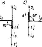 Ранее мы рассматривали параллельную работу синхронного генератора при неизменном токе возбуждения. Что же произойдет в синхронном генераторе, если после подключения его к сети для параллельной работы изменить ток в его обмотке возбуждения, оставив неизменным вращающий момент приводного двигателя? Предположим, что генератор после подключения на сеть работает без нагрузки и его ЭДС Ео уравновешивает напряжение сети Uc. Если при этом увеличить ток в обмотке возбуждения, т. е. перевозбудить машину, то ЭДС Ео увеличится до значения £б и в цепи генератора появится избыточная ЭДС АЕ — Ео— Uc.(рис. 21.10, а), вектор которой совпадает по направлению c. вектором ЭДС Ео- Ток Id, вызванный ЭДС АЕ, будет отставать от нее по фазе на 90° (поскольку пдаО). По отношению к ЭДС Ео этот ток также будет отстающим (индуктивным). С увеличением перевозбуждения значение реактивного (индуктивного) тока увеличится.