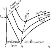 Рис. 21.11. U-образные характеристики синхронного генератора Таким образом, степень возбуждения синхронного генератора влияет только на реактивную составляющую тока статора. Что же касается активной составляющей тока Iq = I1 cosφ1, то она остается неизмелной. Зависимость тока статора I1 от тока в обмотке возбуждения Iв при неизменной активной нагрузке генератора выражается графически U-образной кривой. На рис. 21.11 представлены U-образные кривые I1 = f(I) при Р2 — const. Кривые построены для разных значений активной нагрузки: Р2 = = 0; Р2=0,5Рном и Р2=Рном. U-образные кривые синхронного генератора показывают, что любой нагрузке генератора соответствует такое значение тока возбуждения Iв', при котором ток статора I1 становится минимальным и равным только активной составляющей: Ilmin = I1 cosφ1 = Iq. В этом случае генератор работает при коэффициенте мощности cosφ1= 1. Значения тока возбуждения, соответствующие cosφ1= 1 при различной нагрузке генератора, показаны на рис. 21.11 пунктирной кривой. Некоторое отклонение этой кривой вправо указывает на то, что при увеличении нагрузки ток возбуждения, соответствующий cosφ1 = l, несколько возрастает. Объясняется это тем, что при росте нагрузки необходимо некоторое увеличение тока возбуждения, компенсирующее активное падение напряжения. Необходимо иметь в виду, что при постепенном уменьшении тока возбуждения наступает такое минимальное его значение, при котором магнитный поток обмотки возбуждения оказывается настолько ослабленным, что синхронный генератор выпадает из синхронизма — нарушается магнитная связь между возбужденными полюсами ротора и вращающимся полем статора. Если соединить все точки минимально допустимых значений тока возбуждения на U-образных кривых (штриховая линия в левой части рис. 21.11), то получим линию предела устойчивости работы синхронного генератора при недовозбуждении. С точки зрения уменьшения потерь генератора наиболее выгодным является возбуждение, соответствующее минимальному току статора, т. е. когда cosφ1= 1. Но в большинстве случаев нагрузка генератора имеет индуктивный характер и для компенсации индуктивных токов (отстающих по фазе от напряжения сети) приходится несколько перевозбуждать генератор, создавая условия, при которых ток статора İ1 опережает по фазе напряжение сети Uc. Следует отметить, что для сохранения coscpi неизменным при изменениях активной нагрузки генератора требуется одновременное изменение тока возбуждения генератора. Глава Date: 2015-09-05; view: 1301; Нарушение авторских прав |