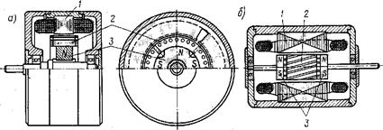 Рис. 23.1. Магнитоэлектрические синхронные двигатели с радиальным (а) и аксиальным (б) расположением постоянных магнитов: I — статор; 2 — короткозамкнутый ротор; 3 — постоянный магнит
