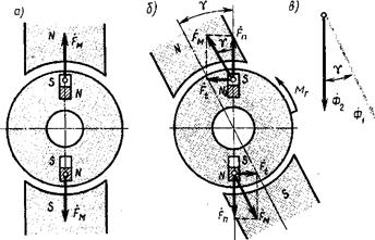 Работа гистерезисного двигателя основана на действии г и с терезисного момента. На рис. 23.6, а показаны два полюса постоянного магнита (поле статора); между ними расположен цилиндр (ротор) из магнитно-твердого материала. Под действием внешнего магнитного поля ротор намагничивается. На стороне, обращенной к северному полюсу постоянного магнита, возбуждается южный полюс, а на стороне ротора, обращенной к южному полюсу постоянного магнита, — северный полюс. На ротор начинают действовать силы Fм, направленные радиально к его поверхности. Если полюсы постоянного магнита вращатьвокруг ротора, то вследствие явления магнитного запаздывание (гистерезиса) активная часть ротора не будет перемагничивать- ся одновременно с изменением направления вращающегося магнитного поля и между осью поля ротора и осью внешнего поля появится угол γ. Силы Fм, действующие на ротор, также изменят свое направление на угол у, а тангенциальные составляющий этих сил Ft создадут гистерезисный момент МГ (рис. 23.6, б).