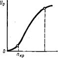 Рис. 28.6. Характерситика самовозбуждения Следует отметить, что самовозбуждение генератора возможно лишь при частоте вращения, превышающей критическую nкр. Это условие вытекает из характеристики самовозбуждения генератора (рис. 28.6), представляющей собой зависимость напряжения генератора в режиме х. х. от частоты вращения при неизменном сопротивлении цепи возбуждения, т.е. U0 — f(n) при rв = const. Анализ характеристики самовозбуждения тика показывает, что при n<nкр увеличение час тоты вращения якоря генератора сопровождается незначительным увеличением напряжения, так как процесса самовозбуждениялет и появление напряжения на выходе генератора обусловлено ^ишь остаточным намагничиванием магнитной цепи генератора. Процесс самовозбуждения начинается при n>nкр. В этом случае увеличение частоты вращения сопровождается резким ростом напряжения Uо. Однако при частоте вращения, близкой к номинальной, рост напряжения несколько замедляется, что объясняется магнитным насыщением генератора. Критическая частота вращения зависит от сопротивления цепи возбуждения и с ростом последнего увеличивается.. Таким образом, самовозбуждение генераторов постоянного тока возможно при соблюдении следующих условий: а) магнитная система машины должна обладать остаточным магнетизмом; б) присоединение обмотки возбуждения должно быть таким, чтобы МДС обмотки совпадала по направлению с потоком остаточного магнетизма Фост; в) сопротивление цепи возбуждения должно быть меньше критического; г) частота вращения якоря должна быть больше критической. Так как генератор параллельного возбуждения самовозбуждается лишь в одном направлении, то и характеристика х.х'. этого генератора может быть снята только для одного квадранта осей координат. Нагрузочная и регулировочная характеристики генератора параллельного возбуждения практически не отличаются от соответствующих характеристик генератора независимоговозбуждения . Рис. 28.7. Внешняя характеристика генератора параллельного возбуждения Внешняя характеристика генератора параллельного возбуждения 1 (рис. 28.7) менее жесткая, чем у генератора независимого возбуждения. Объясняется это тем, что в генераторе параллельного возбуждения помимо причин, вызывающих уменьшение напряжения в генераторе независимого возбуждения (реакция якоря и падение напряжения в цепи якоря), действует еще и третья причина — уменьшение тока возбуждения, вызванное снижением напряжения от действия первых двух причин. Этим же объясняется и то, что при постепенном уменьшении сопротивления нагрузки rн ток увеличивается лишь до критического значения Iкр, а затем при дальнейшем уменьшении сопротивления нагрузки ток начинает уменьшаться. Наконец, ток нагрузки при коротком замыкании Iк<Iкр. Дело в том, что с увеличением тока усиливается размагничивание генератора (усиление реакции якоря и уменьшение тока возбуждения), машина переходит в ненасыщенное состояние, при котором даже небольшое уменьшение сопротивления нагрузки вызывает резкое уменьшение ЭДС машины (см. рис. 28.5, б). Так как ток определяется напряжением на выводах генератора U и сопротивлением нагрузки rн, т. е. I— U/rн, то при токах нагрузки I<Iкр, когда напряжение генератора уменьшается медленнее, чем убывает сопротивление нагрузки, происходит рост тока нагрузки. После того как I=